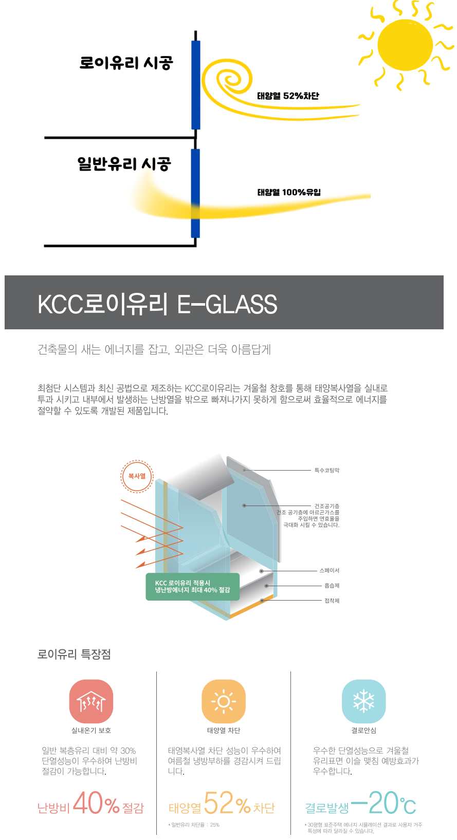 외부의 태양열을 차단해 줌은 물론 겨울엔 실내의 온기를 보호해 주는 역할을 함으로써 냉난방비 절감의 일등공신이라고 할 수 있습니다. 과거엔 로이유리비용이 많이 비쌌으나 지금은 그 비용 또한 상당히 저렴해져 부담이 크게 줄었습니다.