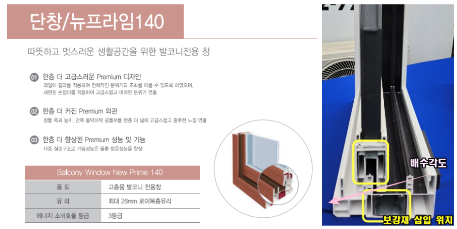 뉴프라임 140제품은 폭이 약 140mm인 제품으로 고층용 발코니 창호로 제작되었으며 외부의 찬 공기, 더운 공기를 차단시키는 기밀성, 열과 냉기를 가둬주는 단열성, 외부의 소음을 차단해 주는 방음성, 태풍 등 바람에 버티는 능력인 풍압성 등이 향상된 제품입니다.