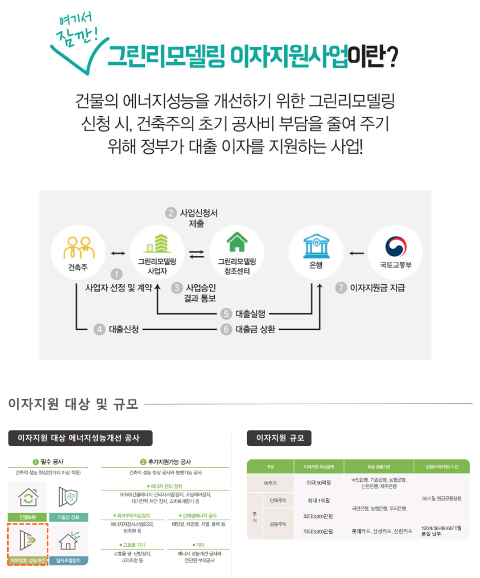 그린리모델링은 국토부산하 국토안전관리원에서 주관하는 사업으로 오래된 창호를 교체 시 창호 교체비를 분납하고 이자비용의 일부를 정부지원해 주는 사업입니다.