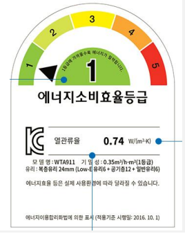 열관류율과, 기밀성(통기량, 등급), 프라임 재질, 유리, 소비효율등급등을 창의 전면에 표시해야만 하는 점 또한 그린리모델링과 다른 내용입니다. 소비자분들 입장에서는 우리집 창호의 소비효율등급이 표시되어 있으니 더욱 안심이될 수 있다 생각이 듭니다.