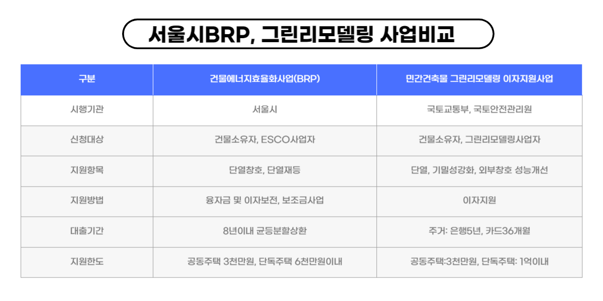 가장 큰 차이는 BRP는 서울시만 가능하고, 그린리모델링은 전국적으로 가능한 사업이었다는점.