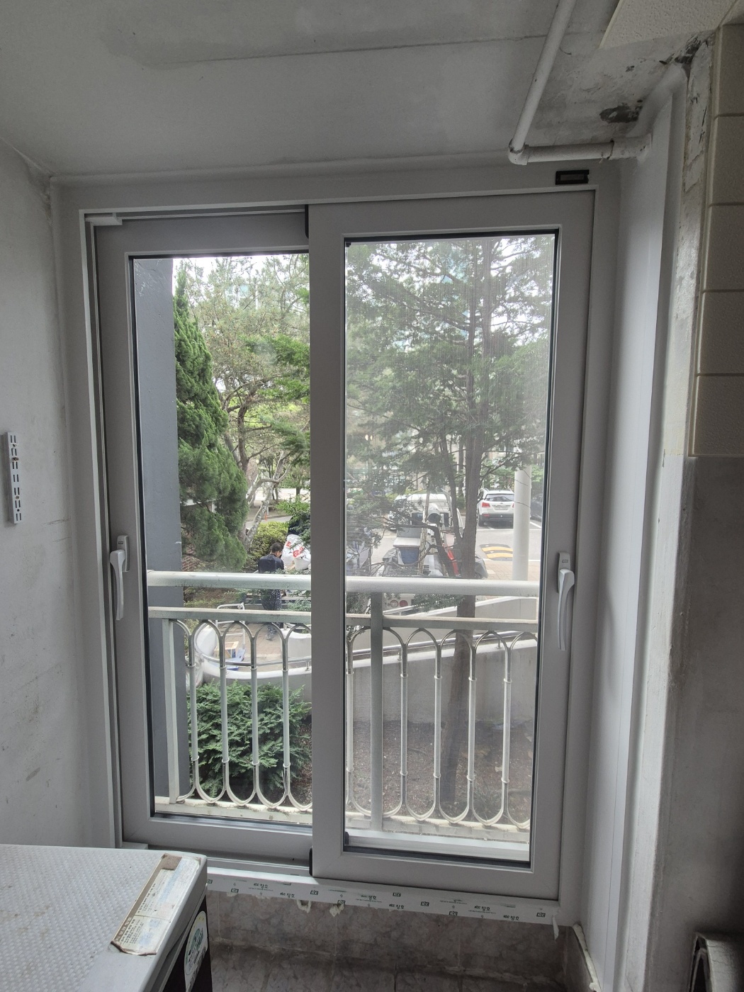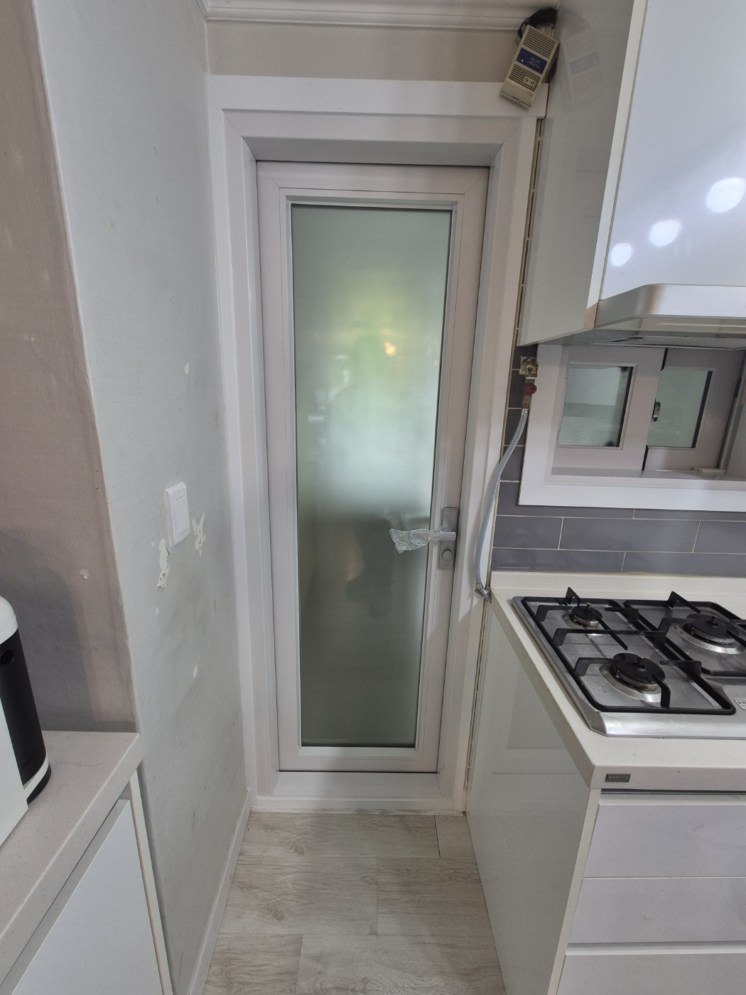 다용도실에 설치된 이플러스 145제품입니다. 기존창을 철거할때 우측의 가스배관아래 부분이 지저분 하게 될 수 밖에 없는 구조라 우측에는 3개의 통바를 처리해서 마감을 진행하였고 좌측도 사진상으로는 구분이 어려우시겠지만 깔끔한 마감및 창틀 고정을 위해 1개의 통바가 설치되었습니다.