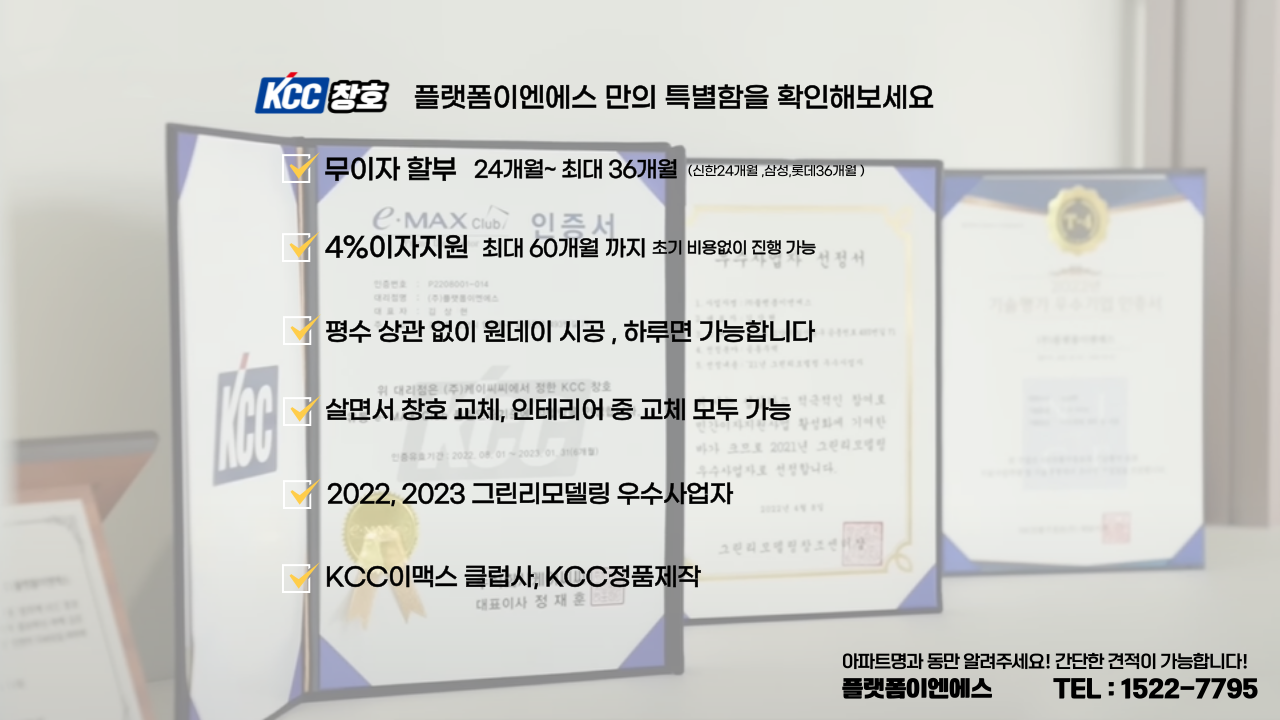 국토해양부 그린리모델링 창조센터에서 우수사업자로 선정된 KCC플랫폼이엔에스에서 좋은품질의 창호, 정확한시공, 합리적인 가격을 제시해드리겠습니다.
